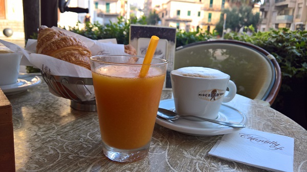 Nach einem leckeren, italienischen Frühstück in der Bar um die Ecke (siehe Foto...so kann der Tag starten!) trudelte ich kurz vor 9 Uhr in der Schule ein. Diese liegt in einem ganz normalen mehrstöckigem Wohn- und Geschäftshaus im Zentrum von Milazzo. Ganz unspektakulär also.